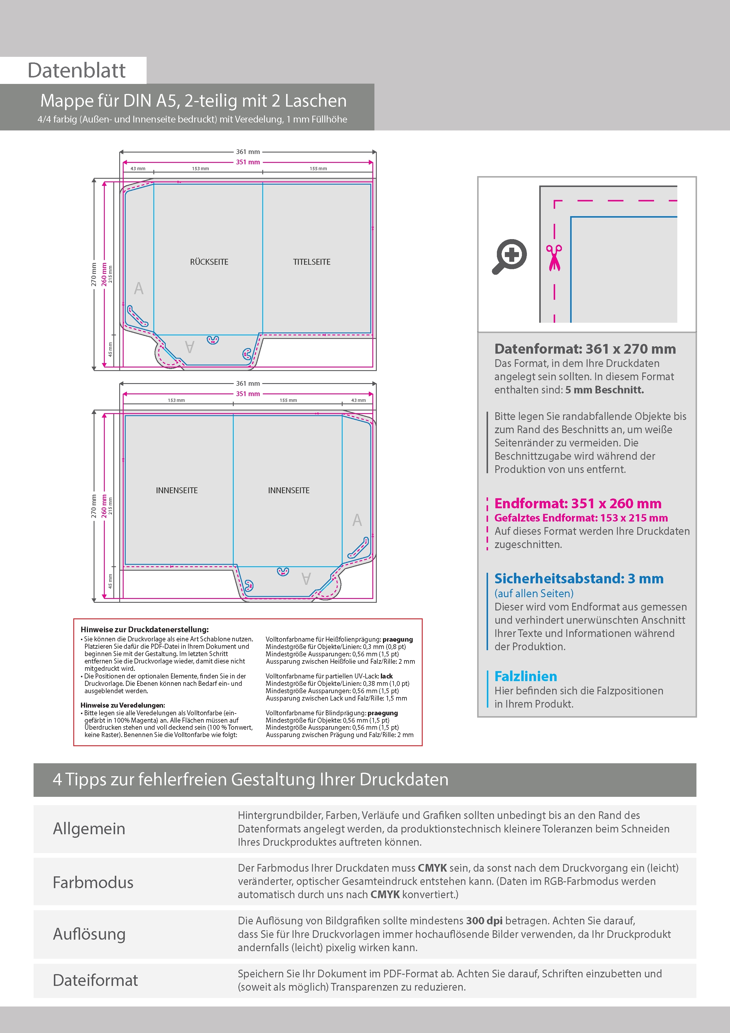 Mappe für DIN A5, 2-teilig mit 2 Laschen, 4/4 farbig (Außen- und Innenseite bedruckt), mit Glanzfolie kaschiert