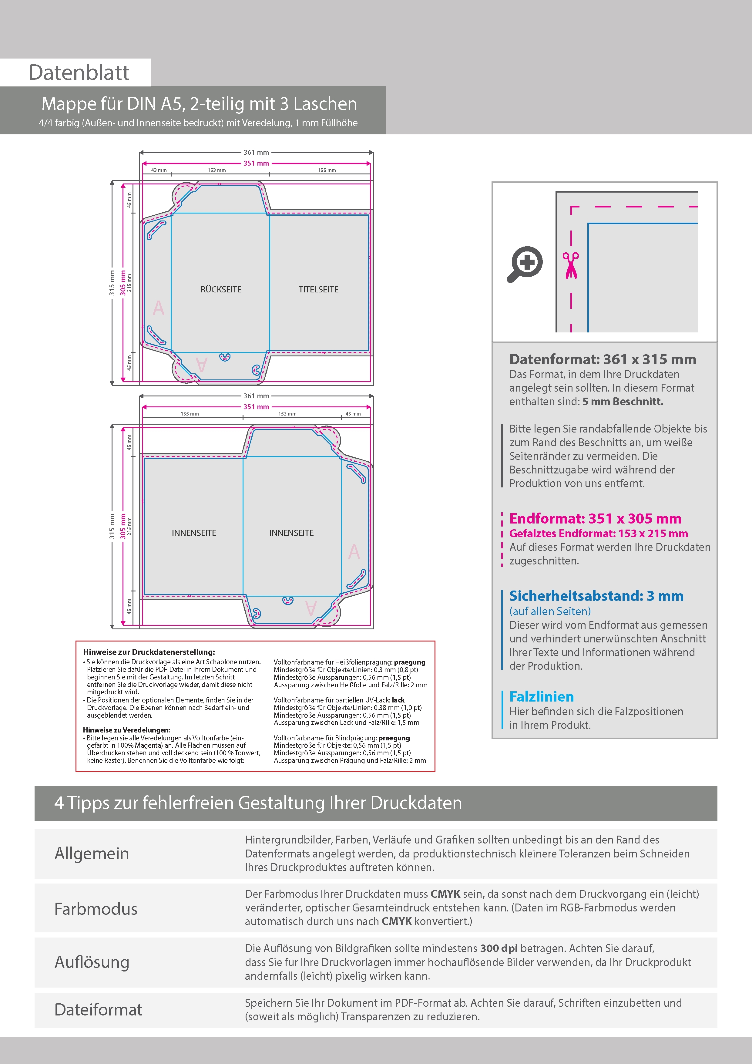 Mappe für DIN A5, 2-teilig mit 3 Laschen, 4/4 farbig (Außen- und Innenseite bedruckt), mit Hochglanz-UV-Lack