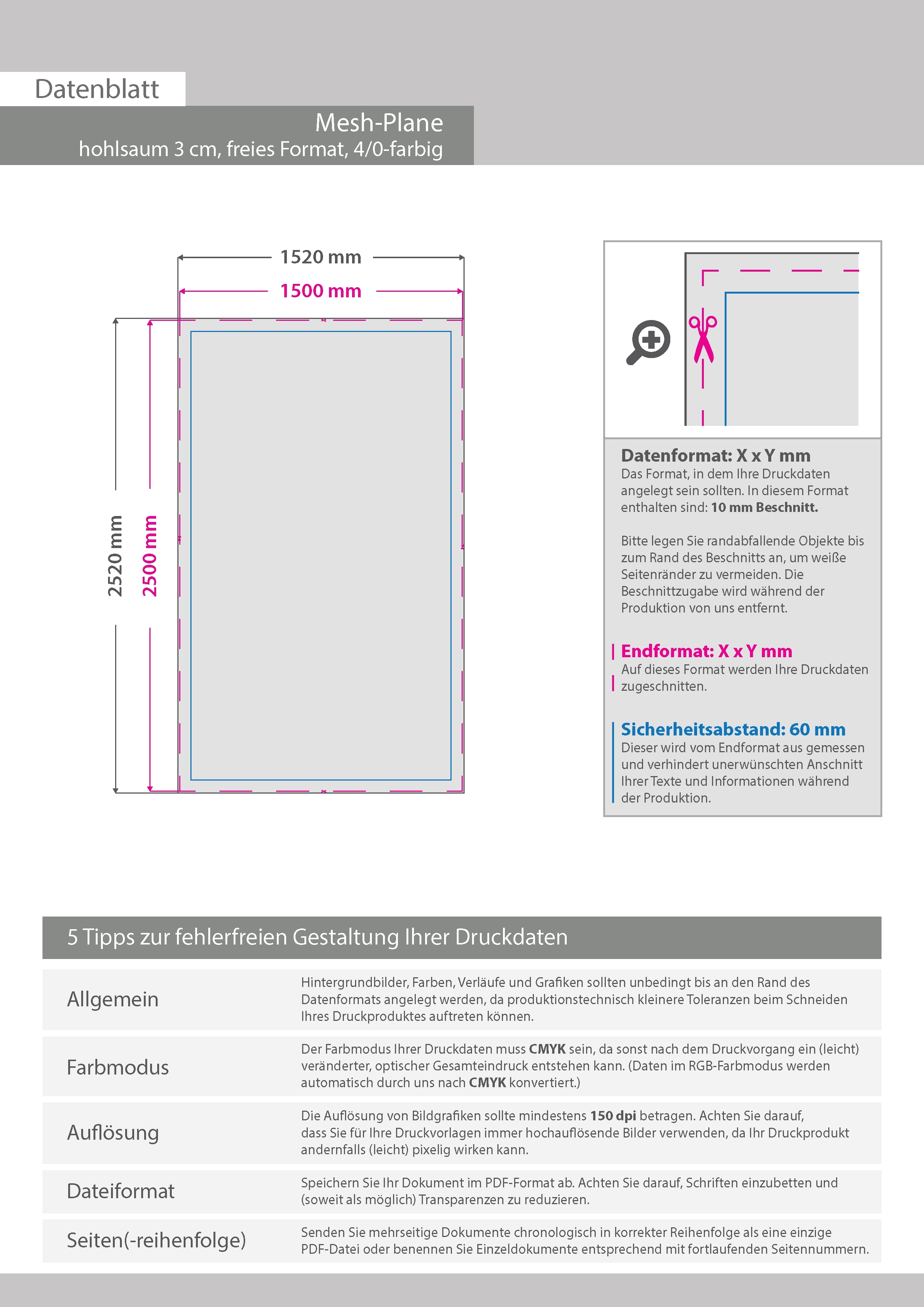 Mesh-Planen (PVC-frei), 4/0-farbig bedruckt, Hohlsaum links und rechts (Durchmesser Hohlsaum 3,0 cm)
