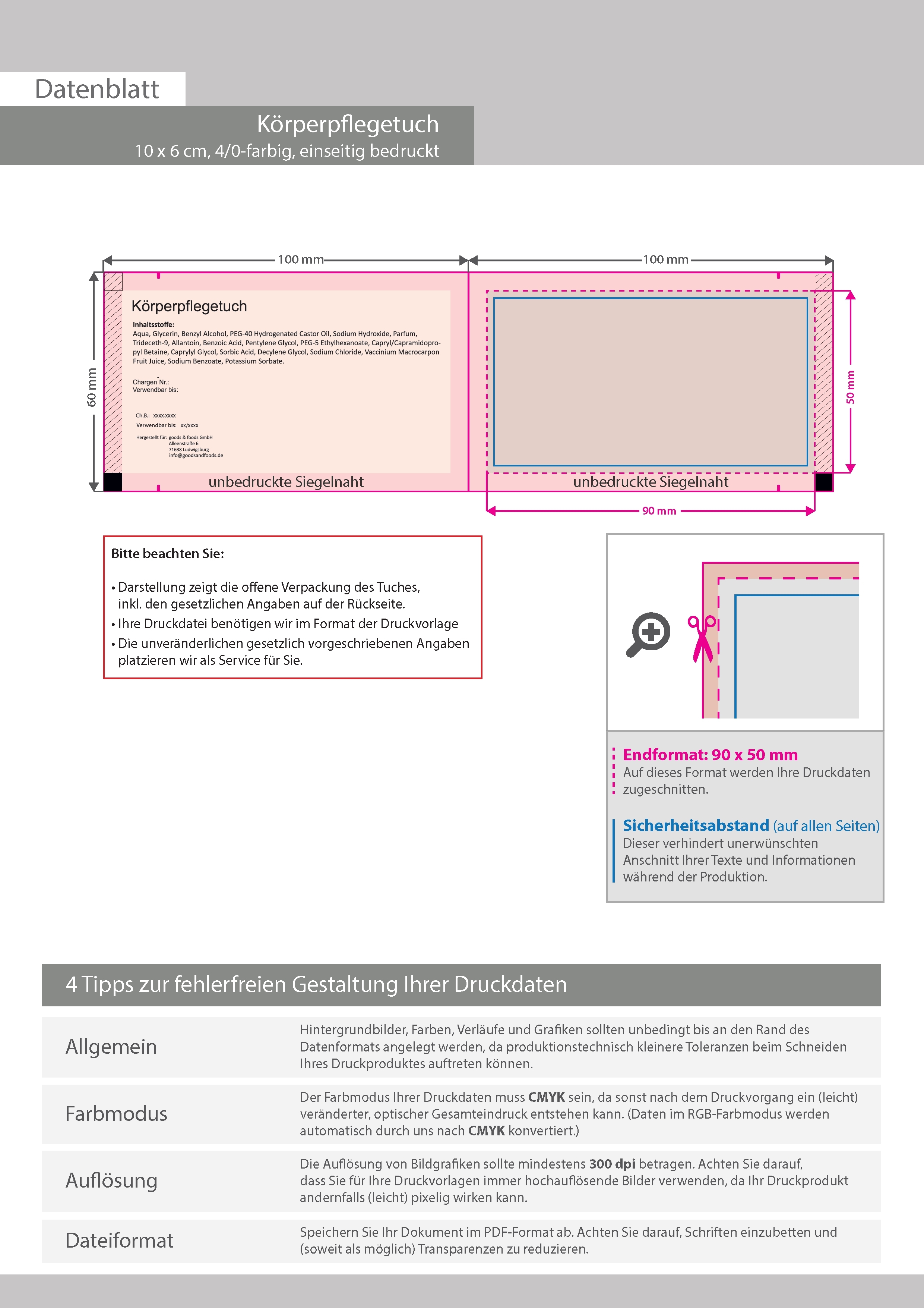 Körperpflegetuch, 10 x 6 cm, 4/0-farbig einseitig bedruckt